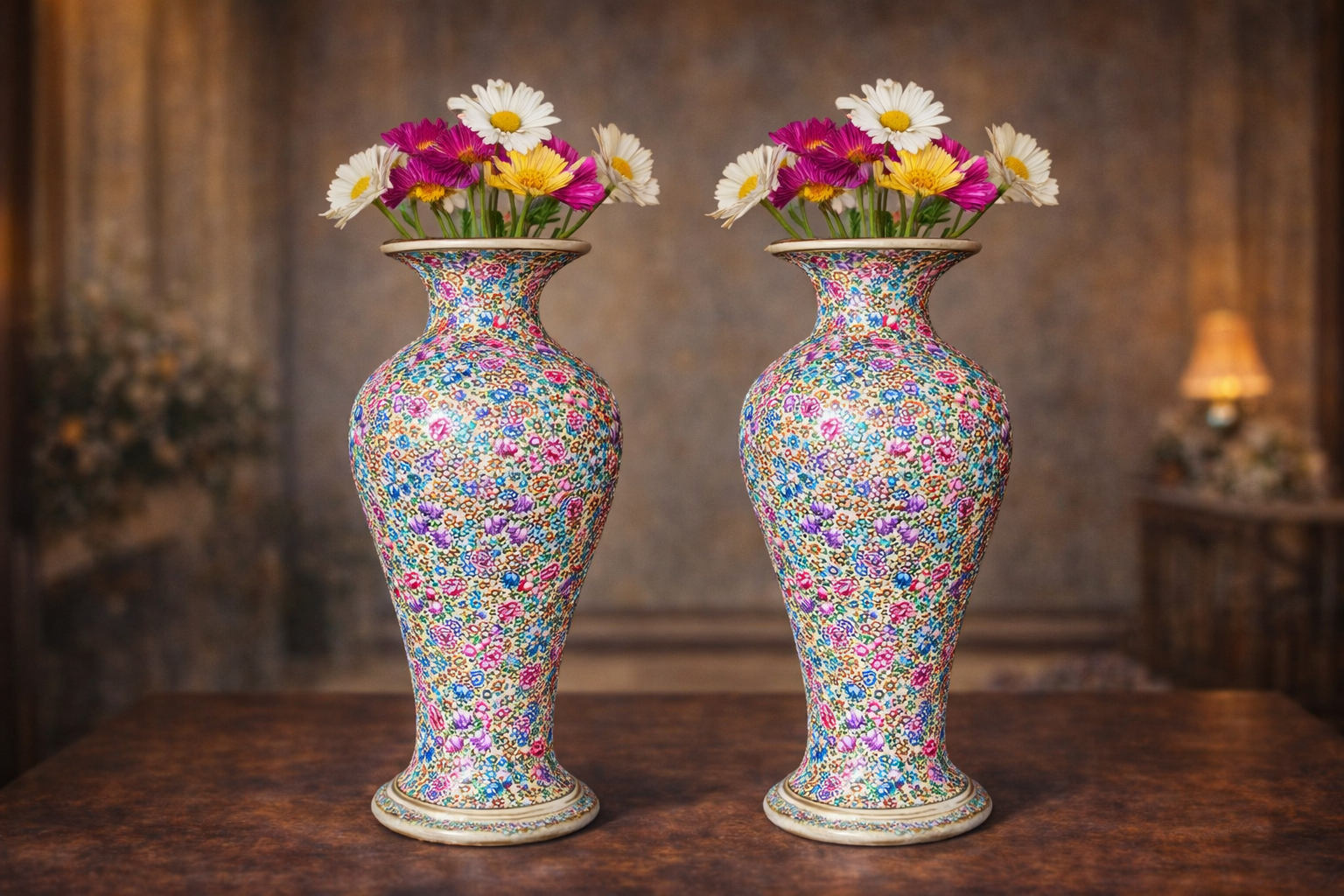 Each vase in this Kashmiri paper mache vase pair is individually made using traditional papier-mâché techniques passed down through generations, ensuring no two pieces are exactly alike. This handmade paper mache vase pair India represents authentic artisanal production where every detail reflects hours of meticulous hand-painting by skilled craftspeople who have perfected their craft across generations.