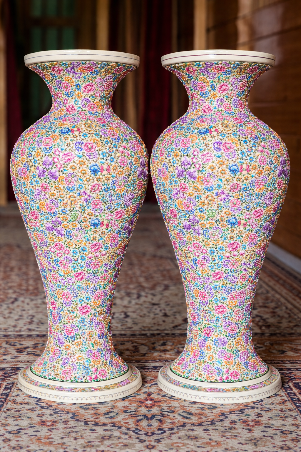 Paper mache vase pair crafted to perfection represents the finest example of traditional Kashmiri artistry and contemporary home décor excellence. Elevate your interior with this magnificent pair of 28-inch embossed floral paper mâché vases, a true celebration of authentic Kashmiri craftsmanship that transforms any space into a gallery of artistic heritage.