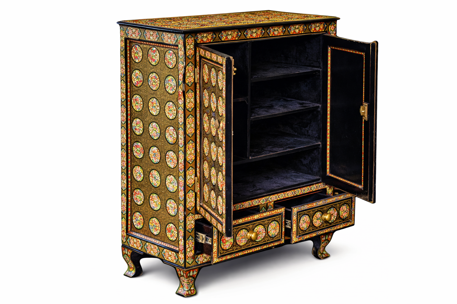 Hazara Art is one of the most intricate painting traditions of Kashmir, known for its dense floral compositions and refined detailing. Each cabinet requires weeks of skilled craftsmanship, involving surface preparation, multiple paint layers, fine brush detailing, and polishing.