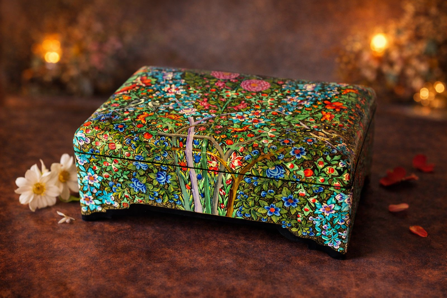 This exceptional paper mache box is ideal for jewelry and keepsake storage, providing secure and beautiful storage for precious items. It serves as luxury home décor that adds sophistication to any room setting. The paper mache box makes an excellent gift choice for weddings and anniversaries due to its timeless elegance. Collectors of fine handcrafted art will appreciate the authentic artisanal quality and traditional craftsmanship. It is also perfect for premium corporate gifting, offering a unique and memorable present for business associates and valued clients.
