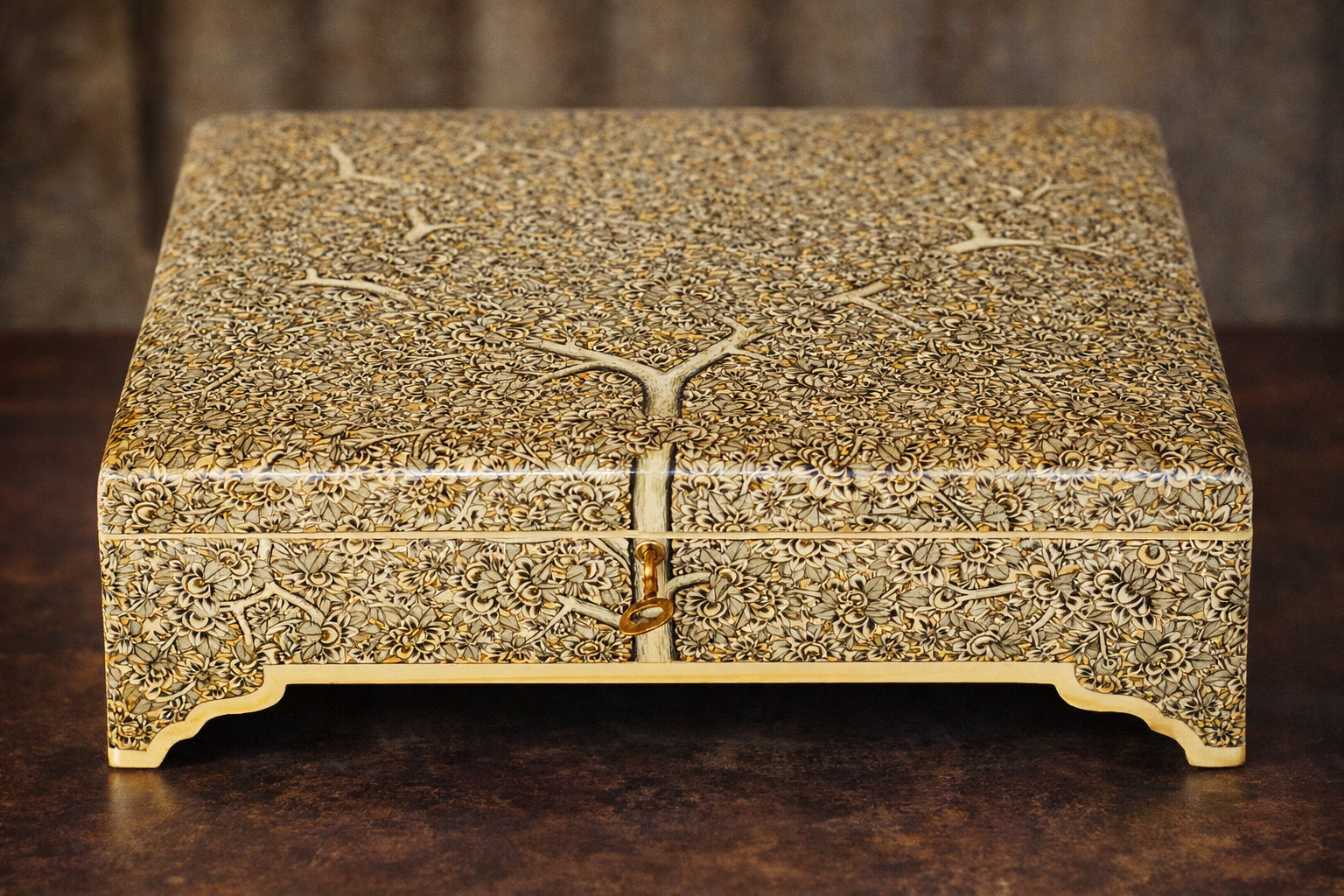Finished in refined antique ivory and gold tones, the surface is enriched with dense floral detailing and sealed with a smooth lacquer polish for long-lasting beauty. The box stands gracefully on carved feet and features an inbuilt brass lock and key, making it ideal for storing jewelry, valuables, or treasured keepsakes securely.